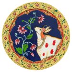 This hand-painted pichwai features a beautiful image of a cow surrounded by colorful flowers. The cow is a sacred animal in Hinduism, and this pichwai would be a perfect addition to any home or puja room.